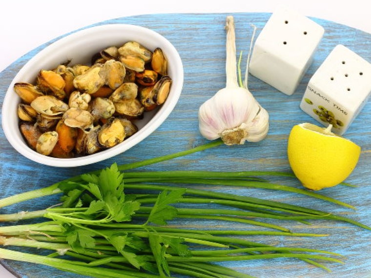 To prepare a seafood snack, take mussels, green onion feathers, garlic, parsley, sunflower oil, salt, ground pepper, lemon juice.