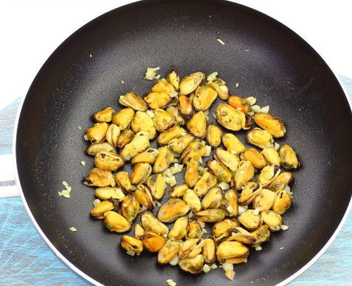 Heat vegetable oil in a skillet. Place the boiled mussels in a skillet.
