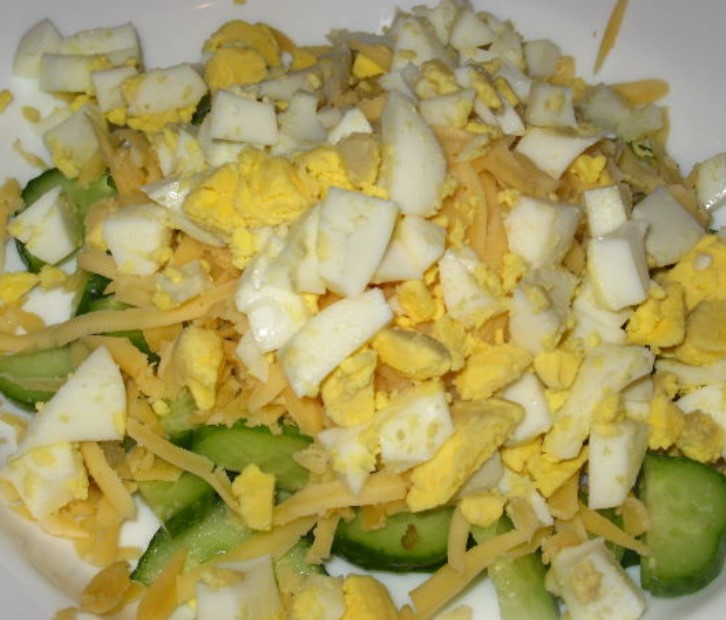An amazing combination of eggs, cucumbers and cheese creates an unforgettable taste of this salad.