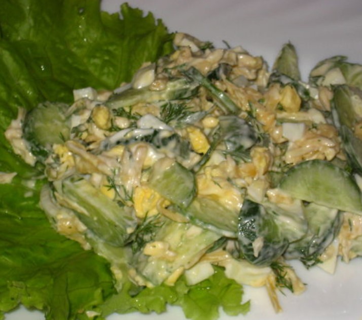 An amazing combination of eggs, cucumbers and cheese creates an unforgettable taste of this salad.