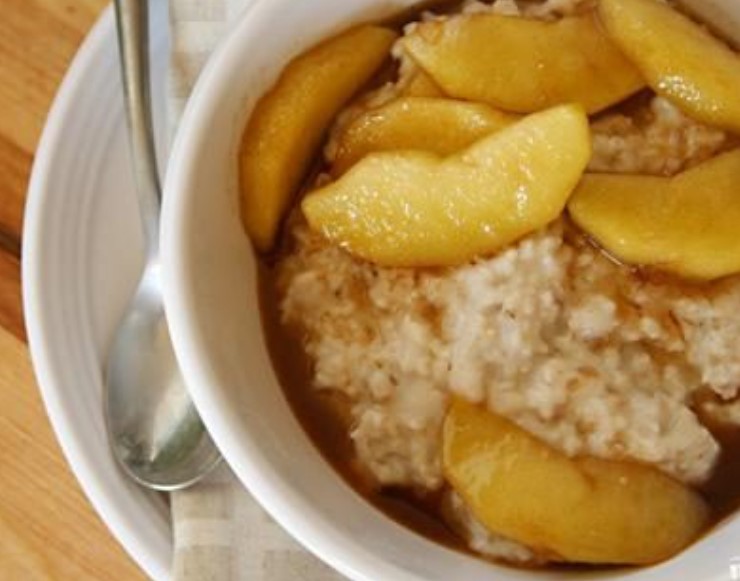Recipe for making oatmeal with apples fried in butter with maple syrup and cinnamon.