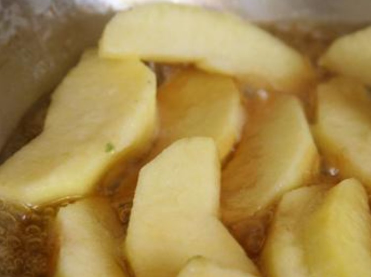 Peel and core the apples, cut into 1 cm slices. Melt the butter in a large skillet over medium heat.
