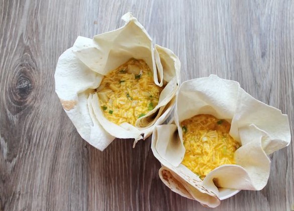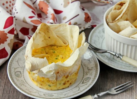 From the lavash, using a plate, cut out two circles with a diameter of about 20 cm. Place the lavash in molds (ramekins), pressing to the bottom and sides, forming waves. Pour the egg mass into tins with pita bread.