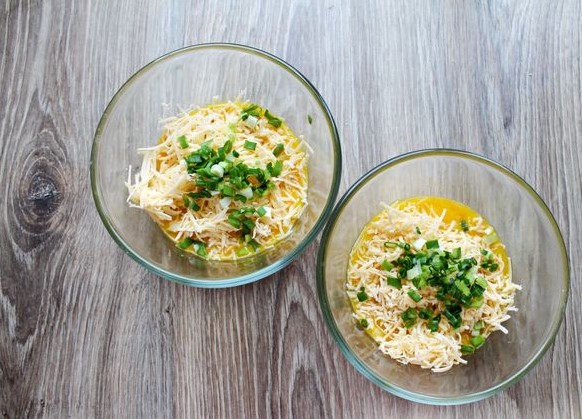 Rinse green onions, dry, and chop finely. Add half each onion to the egg, cheese, and chicken bowls. Mix everything well.