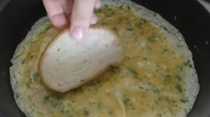 Reduce heat and place a piece of the loaf on the edge of an egg pancake. If the loaf is stale, dip it on all sides in a liquid egg (in a frying pan).