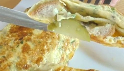 We wrap the edges of the egg pancake so that the stuffed loaf is in an envelope.