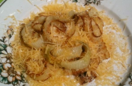 - Sprinkle with breadcrumbs and cheese on each portion of fried onion rings. Onion rings with cheese are ready.