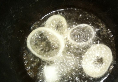 - Fry the onion rings in portions in oil (7-10 minutes over high heat). Then remove with a slotted spoon.