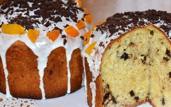 Easter cake with a pronounced orange flavor and chocolate pieces. You can add candied orange fruits and orange liqueur to the dough.
