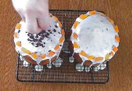 Cover the cooled cakes with icing. Put pieces of dried apricots in a circle, sprinkle the middle with chopped chocolate.