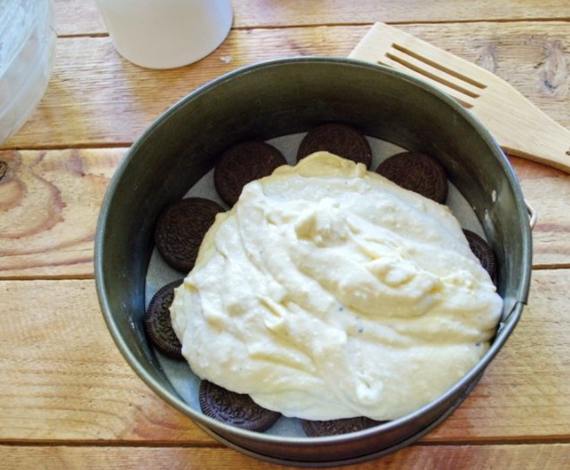 Shake the mold so that the mass lies evenly, but you must not move the cookies on the bottom of the mold.