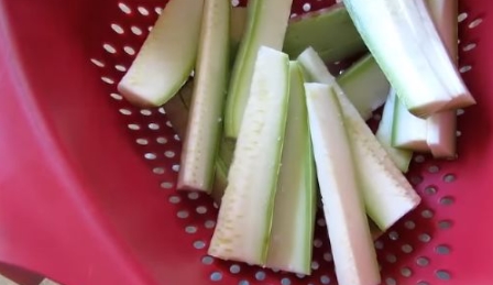 We cut the zucchini into slices, put in a colander and sprinkle with salt. In 15-20 minutes, excess liquid will drain.