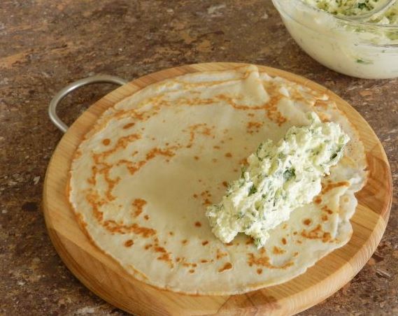 Add chopped spinach to the curd, mix well. Put the filling on the edge of the pancake. Roll up the pancake with a straw. Thus, roll up all the filled pancakes. Trim the edges of the stuffed pancakes evenly.