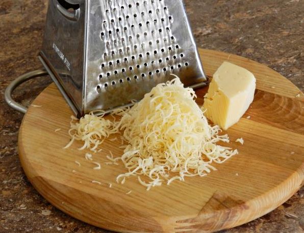 Meanwhile, grate the cheese. 3-4 minutes before the end of cooking, sprinkle the baked pancakes with grated cheese and put them in the oven again. Remove the dish from the oven.