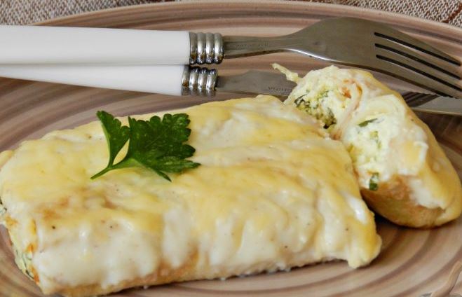 Pancakes with cottage cheese and spinach are prepared according to the cannelloni principle – rolls of spring rolls are baked with béchamel sauce and cheese.