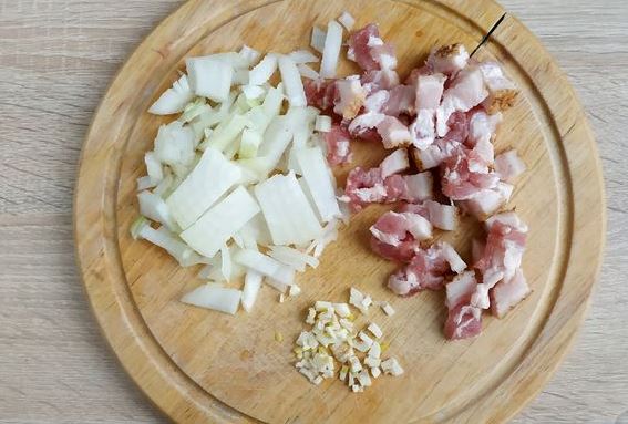 Cut the bacon into cubes or strips. Peel the garlic and onion. Cut the onion into cubes. Chop the garlic.