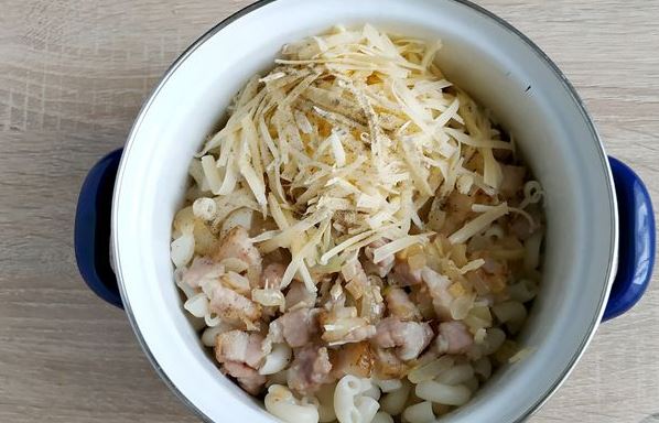Add bacon and onion and half of the cheese to the pasta. Pour black ground pepper here, focusing on your taste.