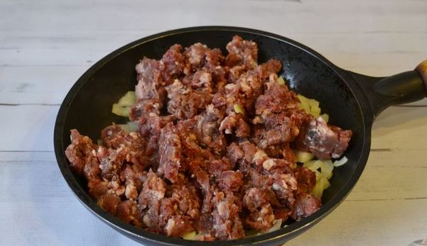 Cut the peeled onions into medium pieces and fry over medium heat with 1 teaspoon of butter for 5 minutes. Add minced meat to the onion.