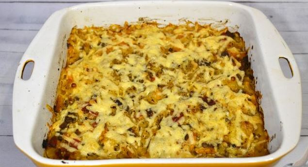 When the cheese is well melted, remove the mold from the oven. Pasta casserole with minced meat, pumpkin, and tomatoes is ready.