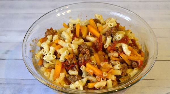 Simultaneously with cooking vegetables and minced meat, cook pasta. In a saucepan, bring water to a boil and salt (1 teaspoon). Add pasta and cook according to package directions. Then place the pasta in a colander and drain. Pour 100 ml of pasta water into a separate container and set aside. Transfer the pasta to a bowl with the minced meat and vegetables. Stir the ingredients.