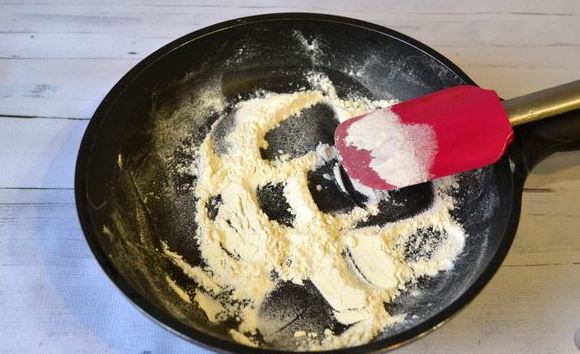 Prepare the fill. To do this, add flour to a dry frying pan. Stirring constantly, fry the flour over medium heat until light nutty flavor and color change.