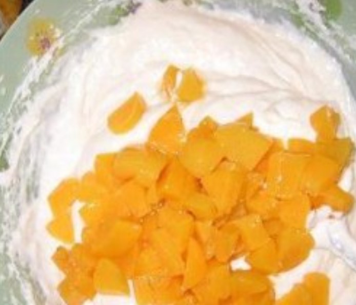In hot water mixed with peach juice, dissolve gelatin. Mix the yogurt with sugar. Pour the gelatin mixture into the resulting yoghurt mass in a thin stream (but only when it cools down). Put it in the refrigerator. At this time, remove the peaches from the jar, let the excess liquid drain and cut them into cubes. Next, in one bowl, beat the cream with a mixer. In another, beat the protein until white foam and add a drop of lemon juice. Take the yoghurt mass out of the refrigerator, stirring constantly, first carefully pour in the whipped cream, then the protein, and at the end add the chopped peaches.