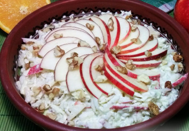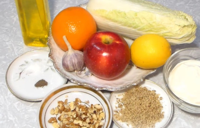 The peculiarity of this Peking cabbage and apple salad is in the dressing and slicing. Salad ingredients are cut into strips. The dressing is made with sour cream, garlic, nuts and orange juice.