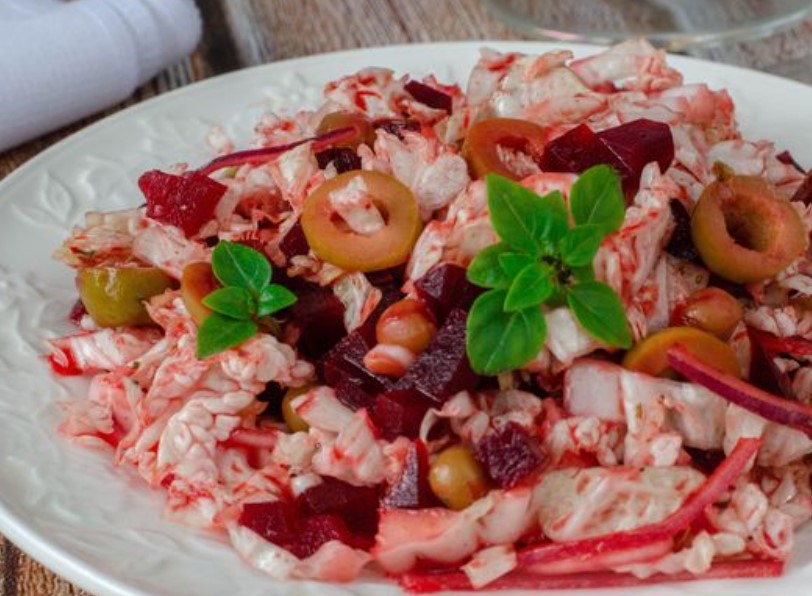 Peking cabbage and beetroot salad turns out to be light, juicy and very tasty. Olives and canned green peas fit perfectly into this salad. A fragrant dressing of lemon juice, vegetable oil and basil makes the taste of the salad even brighter. And this vegetable salad is also full of vitamins.