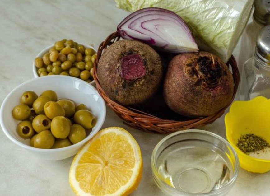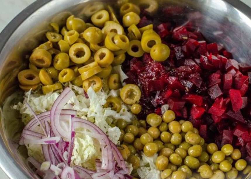 Peking Cabbage and Beetroot Salad with Olives and Canned Peas
