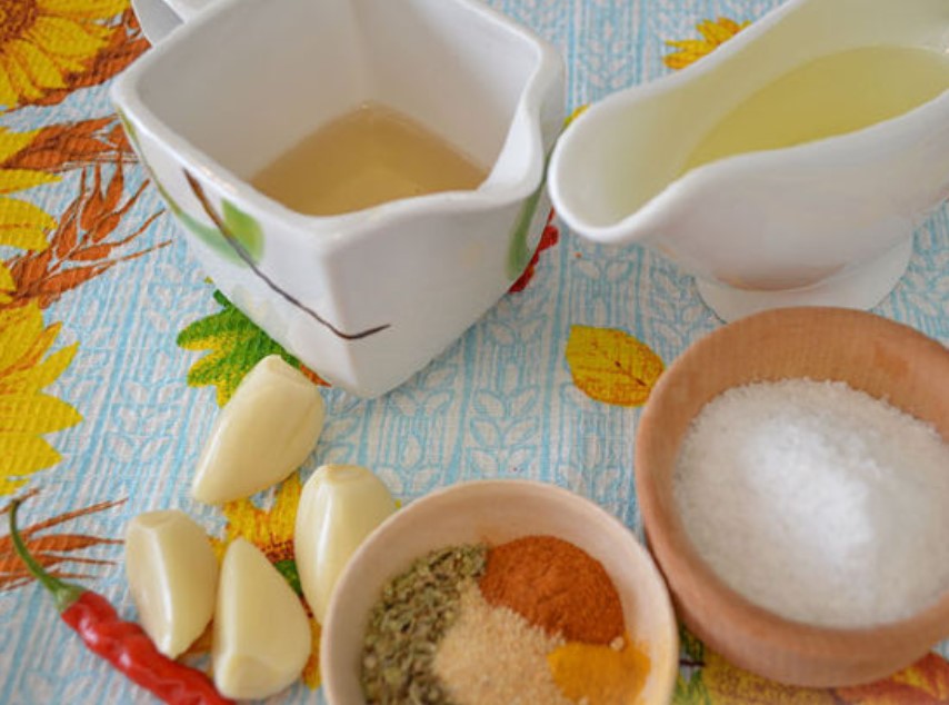 Mix oil, vinegar, salt, spices, garlic, hot pepper in a bowl.