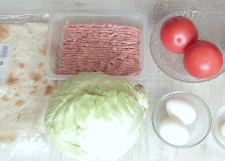 For cooking, take fresh cabbage, pita bread, minced meat, chicken eggs, garlic, tomatoes, salt, pepper to taste, sour cream, butter and cheese (optional).