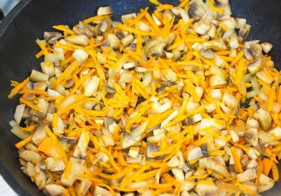 Fry mushrooms in vegetable oil in a preheated deep frying pan. Add the onion to the mushrooms and fry until transparent. Add carrots, mix and simmer mushrooms and vegetables for 3 minutes. Add a little salt.