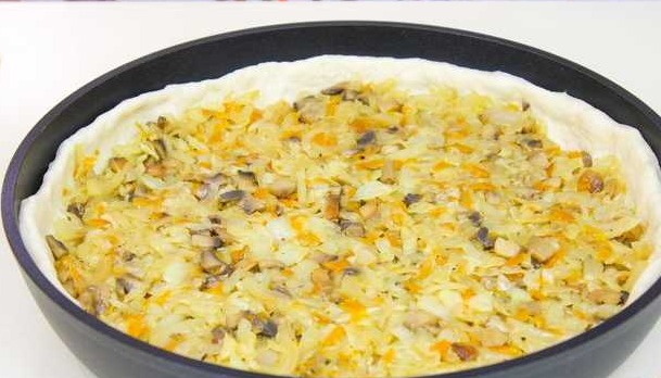 Roll out each part of the dough into a layer 0.5 cm thick. Most of it will be the bottom of the cake, roll it out a little larger than the size of a baking dish. Lubricate the mold (28 cm in diameter, 5 cm high) with vegetable oil. We spread the rolled out most of the dough into it, form the sides. We spread the cooled cabbage filling on the dough, level it.