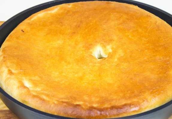 Roll out the second, smaller part of the dough. Cover the filling. We pinch the edges of the dough and make a hole in the center for steam to escape. Preheat the oven to 180 degrees. Cover the cake with a napkin and leave it for 10 minutes. Grease the cake with water on top (this is optional). We bake a cabbage pie from yeast dough in a preheated oven at 180 degrees for about 30 minutes, until a slight blush.