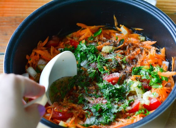 Cut onion, peppers and tomatoes into small pieces. Grate the carrots on a coarse grater. Place all vegetables in the multicooker bowl.