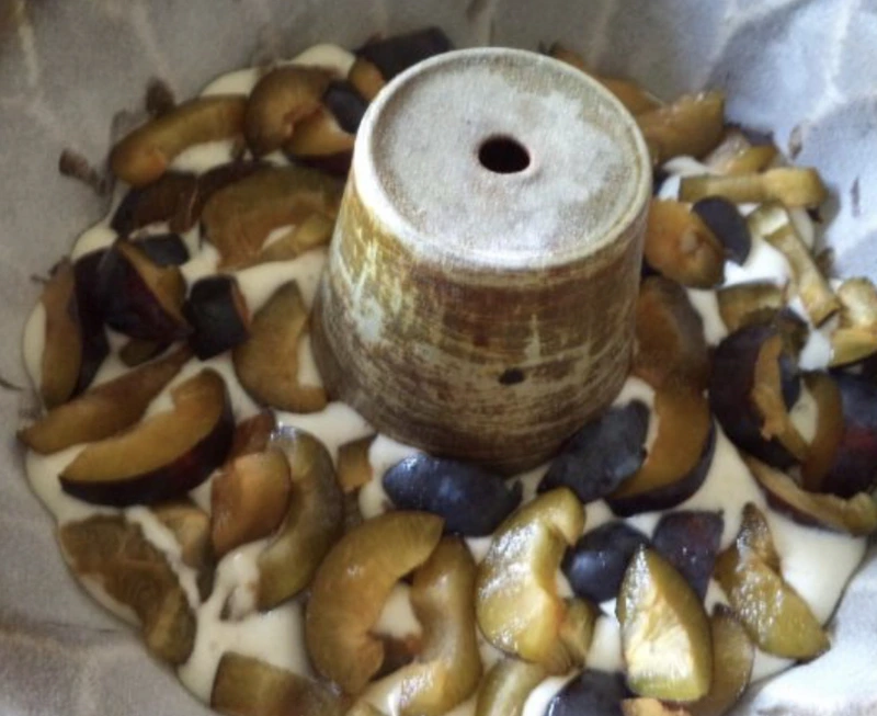 - Pour the remaining dough over the plums. Put the form with the dough on the middle shelf in the oven preheated to 180 degrees.