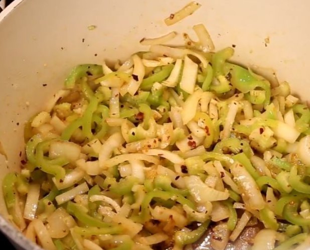Heat vegetable oil in a saucepan, add chili flakes. Then add chopped onions, celery, green peppers and squeeze out the garlic. Stir and fry a little, stirring occasionally.