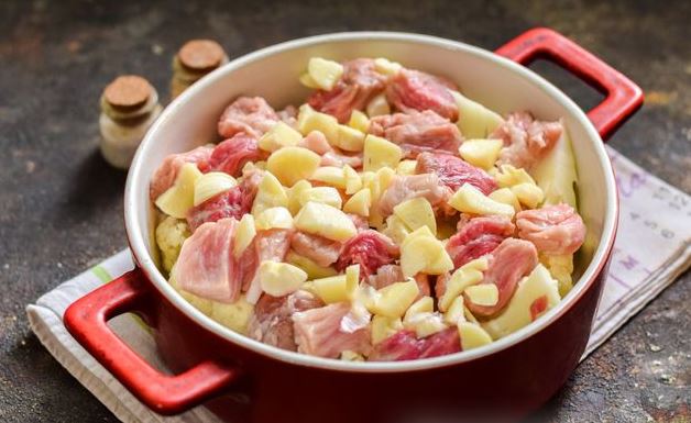 Rinse the pork, dry, and cut into small pieces. Prepare a heat-resistant form, you do not need to lubricate it with oil. Put the cauliflower in a dish, spread the pork pieces on top.