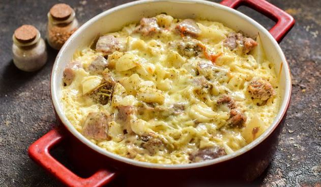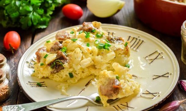 Pork Baked with Cauliflower and Cheese, in Egg and Milk Sauce