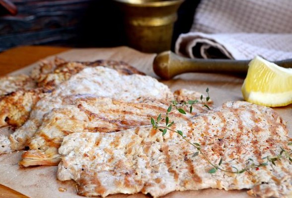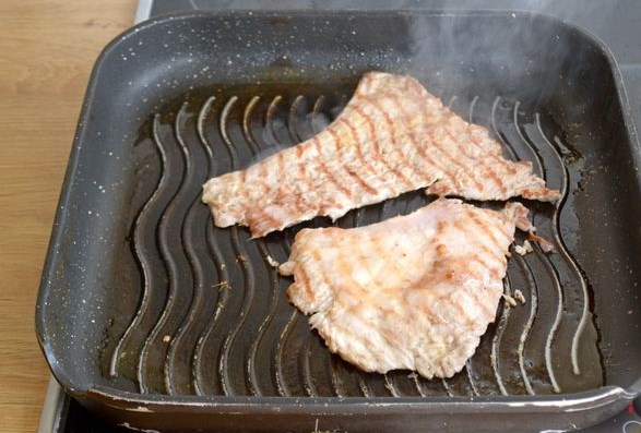Spread the pork on a plank and brush over the marinade. Leave it on for 30 minutes. Heat a grill pan and brush it with vegetable oil. Place the cuts of meat in a skillet and fry over high heat for 1-2 minutes on each side.