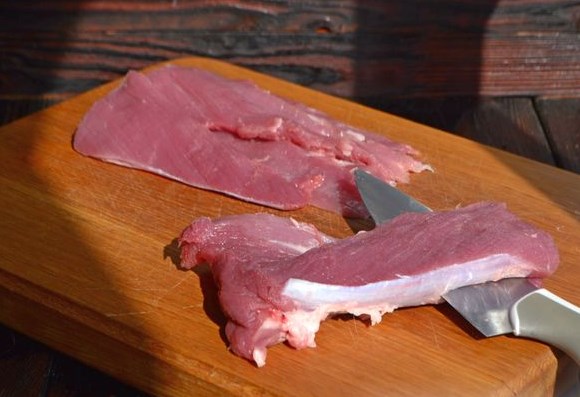 Cut a long tenderloin in half (across the grain) and then cut each piece along the grain into three pieces. Place a flat piece of tenderloin in a plastic bag or cover with cling film and beat to a thickness of 0.5 cm.