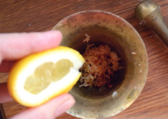 Prepare the marinade. Peel the garlic and pass through a press. Combine chopped garlic, salt, ground pepper, and 1 tablespoon. a spoonful of freshly squeezed lemon juice. Stir.