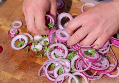 Chop 2 purple onions. We will need it to decorate the finished dish. Of course, you can use a regular white bow, but purple is sweeter, moreover, it will look prettier, so I made a choice in its favour. Divide the chopped onion into rings, add it and mix with the rest of the parsley. Lightly knead everything together and leave to marinate. We only need this onion at the very end of the recipe.