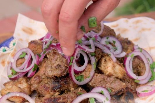 The kebab is completely ready, and now I propose to serve it beautifully. Put pita bread on a dish. We spread the shish kebab on the pita bread. We decorate the kebab with purple onions, parsley and salt, which we prepared in advance.