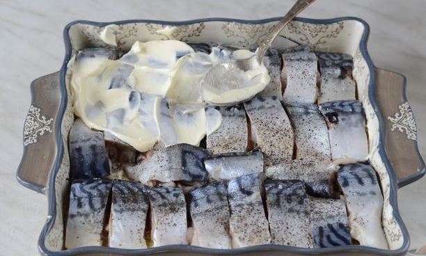 Grease a layer of potatoes with mayonnaise. Put mackerel pieces on top of the potatoes. Salt, pepper, and grease with a thin layer of mayonnaise. Put the remaining potatoes on the fish. Salt, pepper, and grease with mayonnaise again.