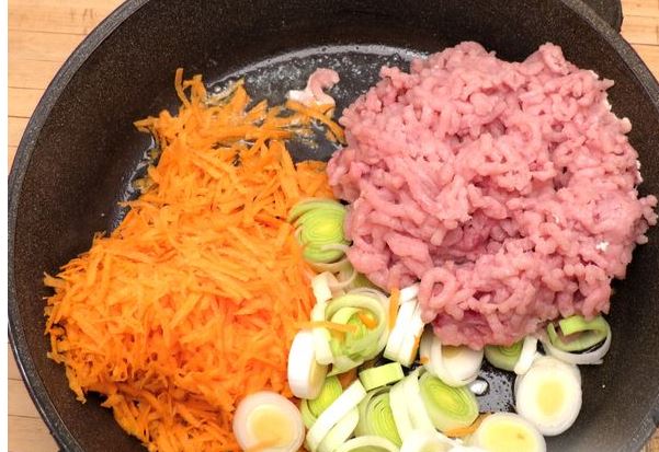 Fry the carrots, leeks and minced meat in hot butter until half cooked, 5-7 minutes. Salt and pepper the minced meat with vegetables, mix until smooth. Finely chop the green part of the leek.