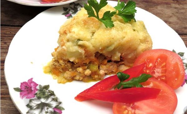 Lubricate the form with a mixture of oil and garlic. Sprinkle with breadcrumbs and place half of the puree on the bottom of the mold. Put the minced meat with vegetables on top.