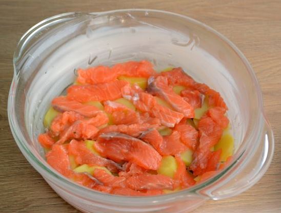 Prepare all the ingredients for the Salmon Potato Casserole. Cut the salmon into fillets, removing all bones and skin. Peel and wash the potatoes. Instead of low-fat cream, you can use a combination of 33% fat cream and milk in a 1: 2 ratio.