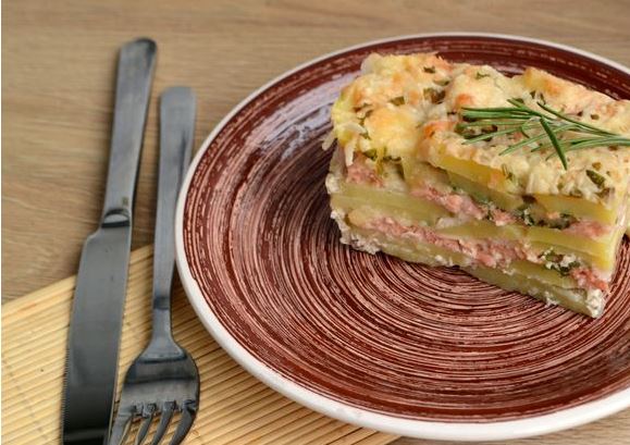 Potato casserole with salmon is ready! Before serving, the casserole must be cooled so that it is cut into neat pieces.