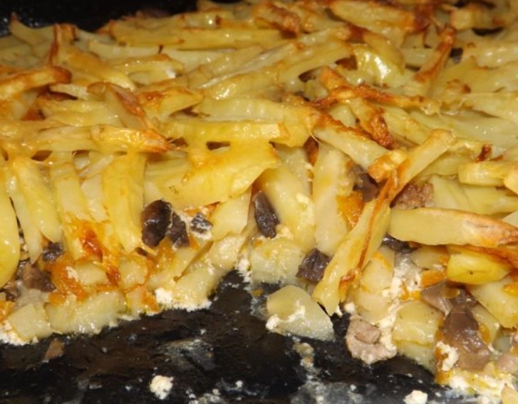 Put 1/2 part of the potatoes on a baking sheet, salt and add potato seasoning to taste. Put the minced meat with onions in the next layer, then mushrooms with carrots